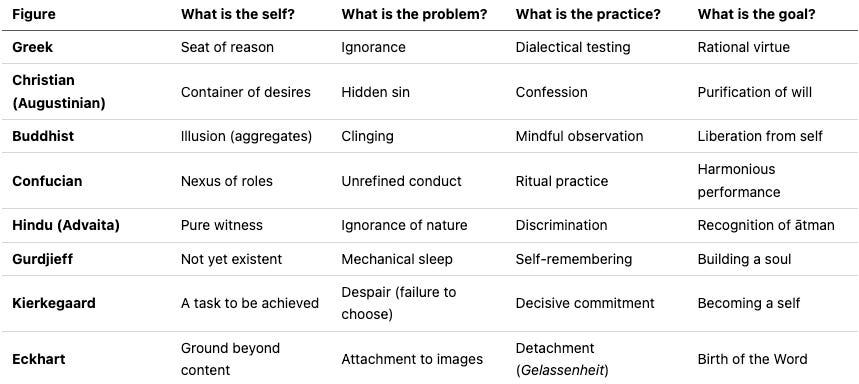 Gurdjieff stands outside the confession-excavation model entirely. You cannot confess your hidden desires because you do not have a unified “you” with coherent desires. The multiple I’s have contradictory desires; asking “what do I really want?” assumes a unity that does not exist.